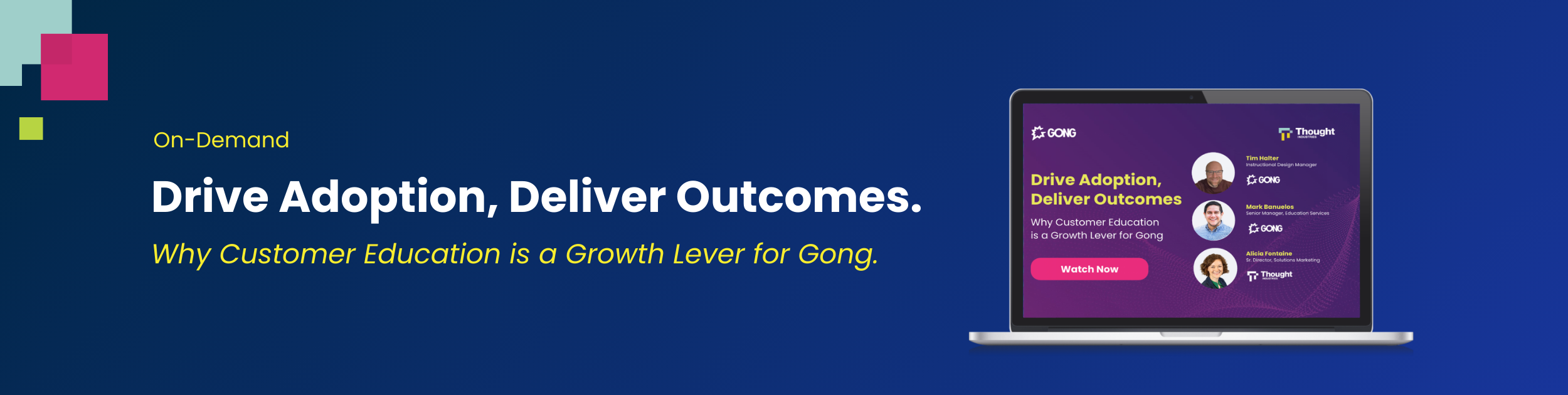 Watch our latest webinar on demand: Drive Adoption, Deliver Outcomes: Why Customer Education is a Growth Lever for Gong, and hear directly from the team behind Gong’s strategy: Tim Halter (Instructional Design Manager, Gong), Mark Banuelos (Senior Manager of Education Services, Gong), and Alicia Fontaine (Senior Director of Solutions Marketing, Thought Industries).